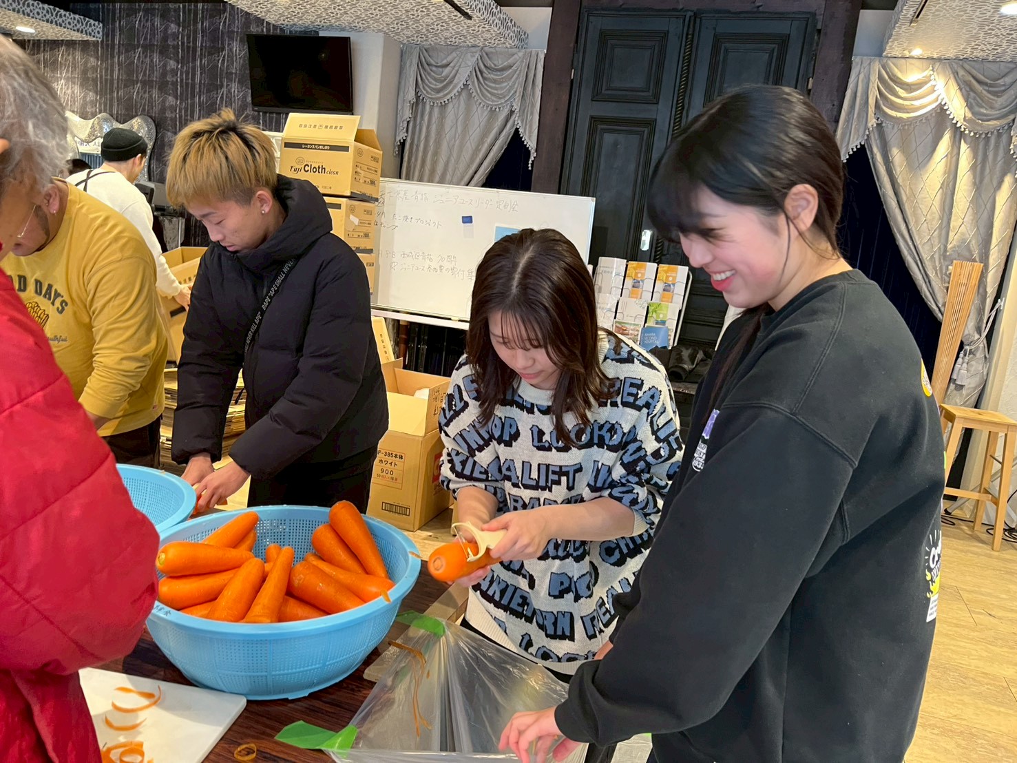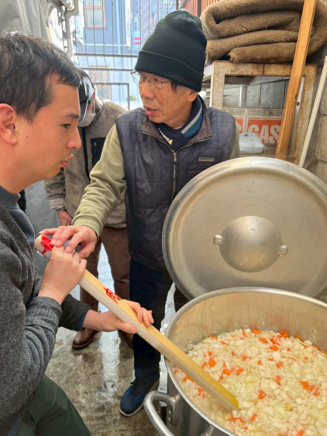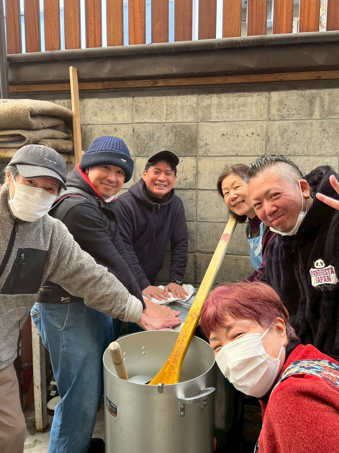 寒い外でも寸胴を触ると温かい!寒いなかでも和気藹々やってます!