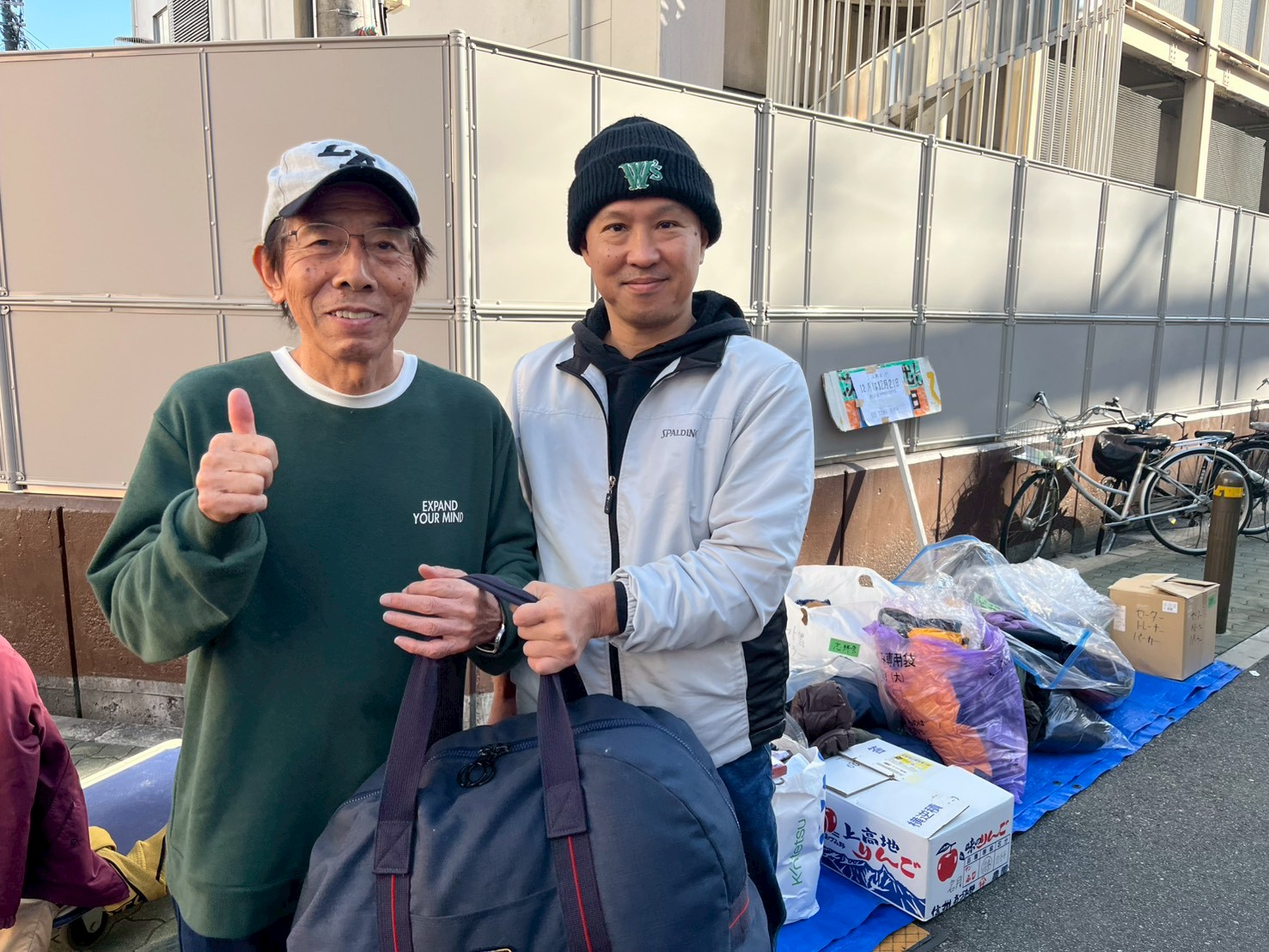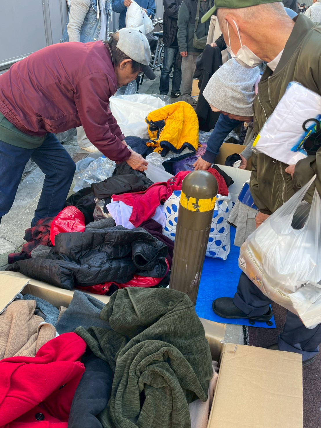 毎年この時期になると、スタッフさんが新聞で防寒着を募ってくれます。今年も皆さんの温かい思いで沢山の防寒着が集まり、スタッフ皆で配らせてもらいました。一人のおっちゃんへ「これどう?格好良いと思うよ!」と勧めると「これは派手やろ~」と最初は言ってましたが、結局持って帰られました。それを着て再び現れたおっちゃんは、私に「選んでくれたのどう?似合うやろ?」とヒョウ柄のシャツを嬉しそうに披露してくれました(笑)
